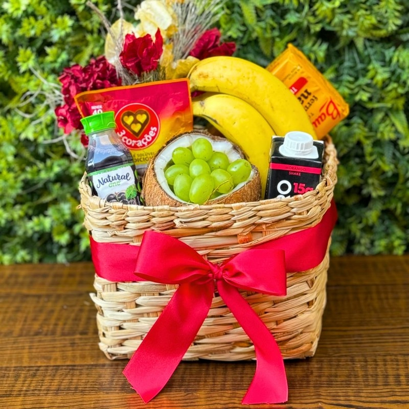 Conteúdo da Cesta > Cachepo quadrado > Laço de cetim decorativo > Flores desidratadas > Torrada Baudduco Integral > Café soluvel > Banana nanica > Suco One 180ml sabor uva > Bebida Whey > Coco seco > Uva