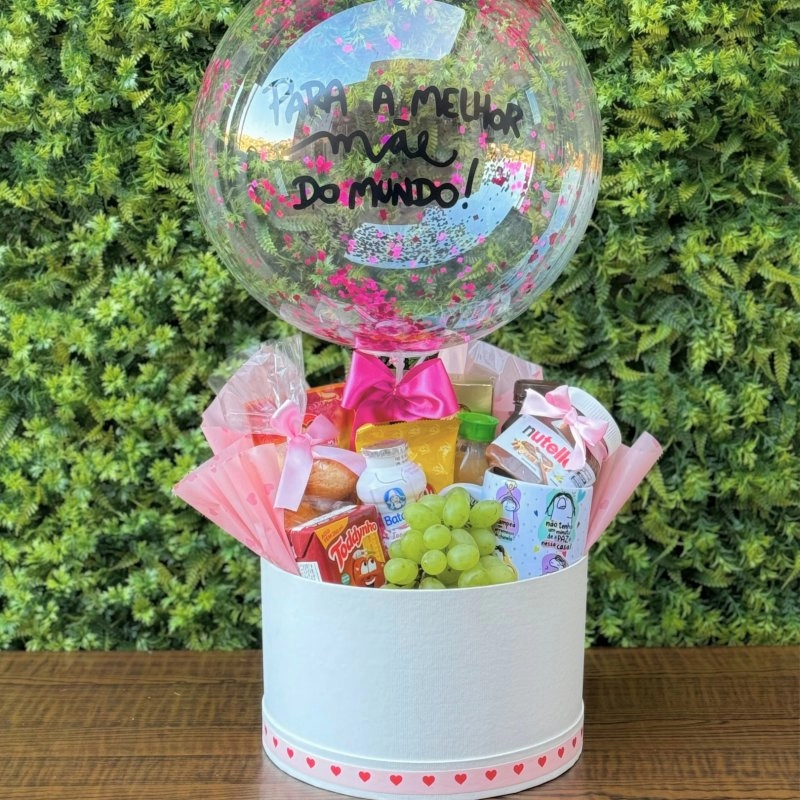 Conteúdo da Cesta > Caixa Box > Decoração feminina e delicada > Balão Bubble Personalizado com glitter > Caneca de Porcelana Personalizada (CONSULTE MODELOS) > Café solúvel > Ferrero Rocher com 08 und > Nutella > Bebida láctea Cappuccino pronto 260ml > Suco One 180ml > Pão de mel > Pão de queijo > Iogurte > Toddynho > Uva