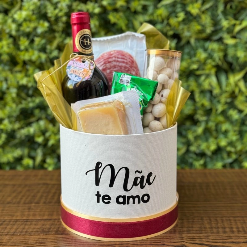 Conteúdo da Cesta > Box P na cor Branco > Personalização na caixa > Laço bola para fechamento > Vinho suave > Pote com Ovinhos de amendoim Elma Chips > Salame > Amendoim > Queijo