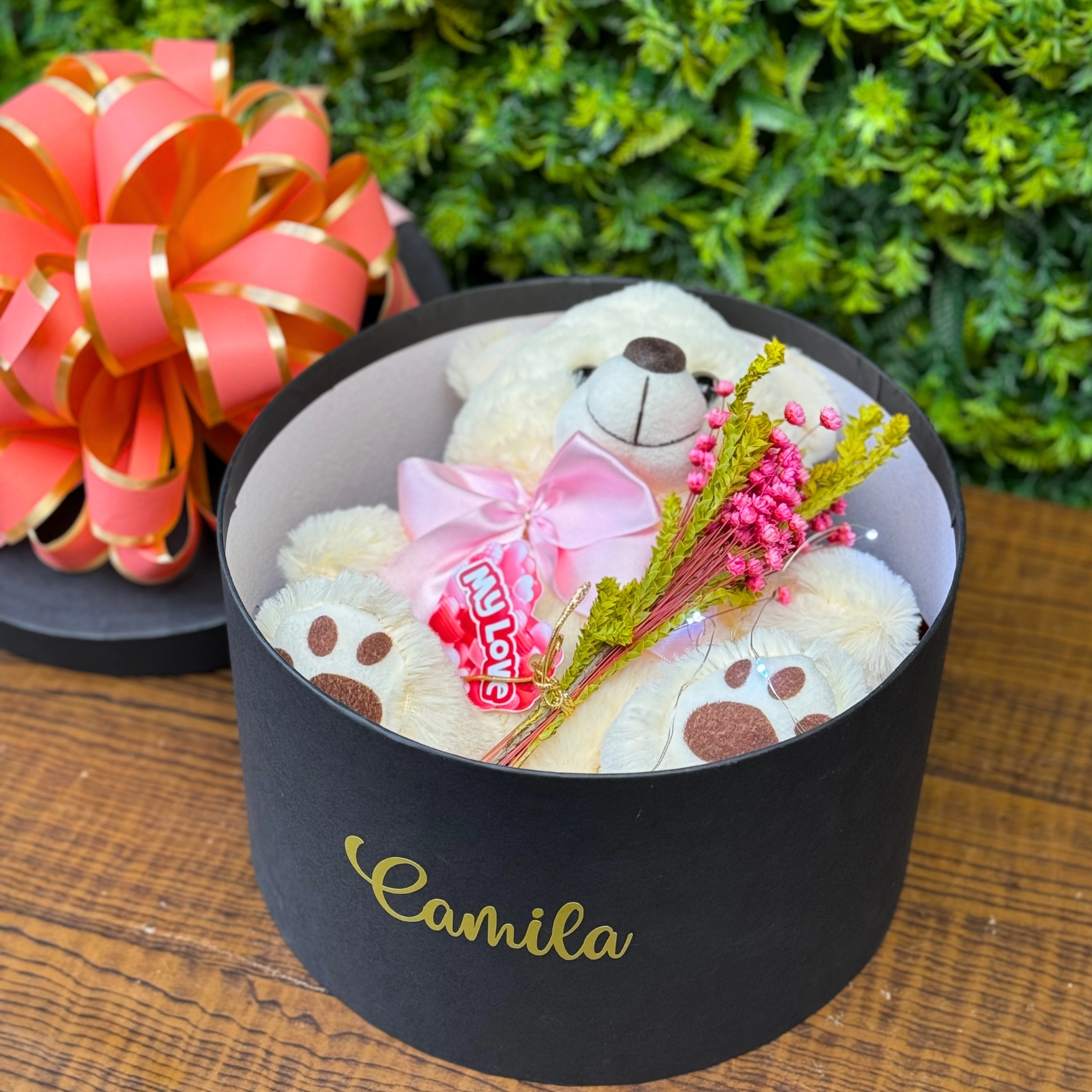 • 15 Deliciosos Bombons sortidos Nestle • 15 Bombons sortidos Lacta para adoçar o paladar • Uma pelúcia fofinha para abraços aconchegantes • Um ramalhete de flores desidratadas para decorar e encantar • Luzes de Led para criar um ambiente romântico
