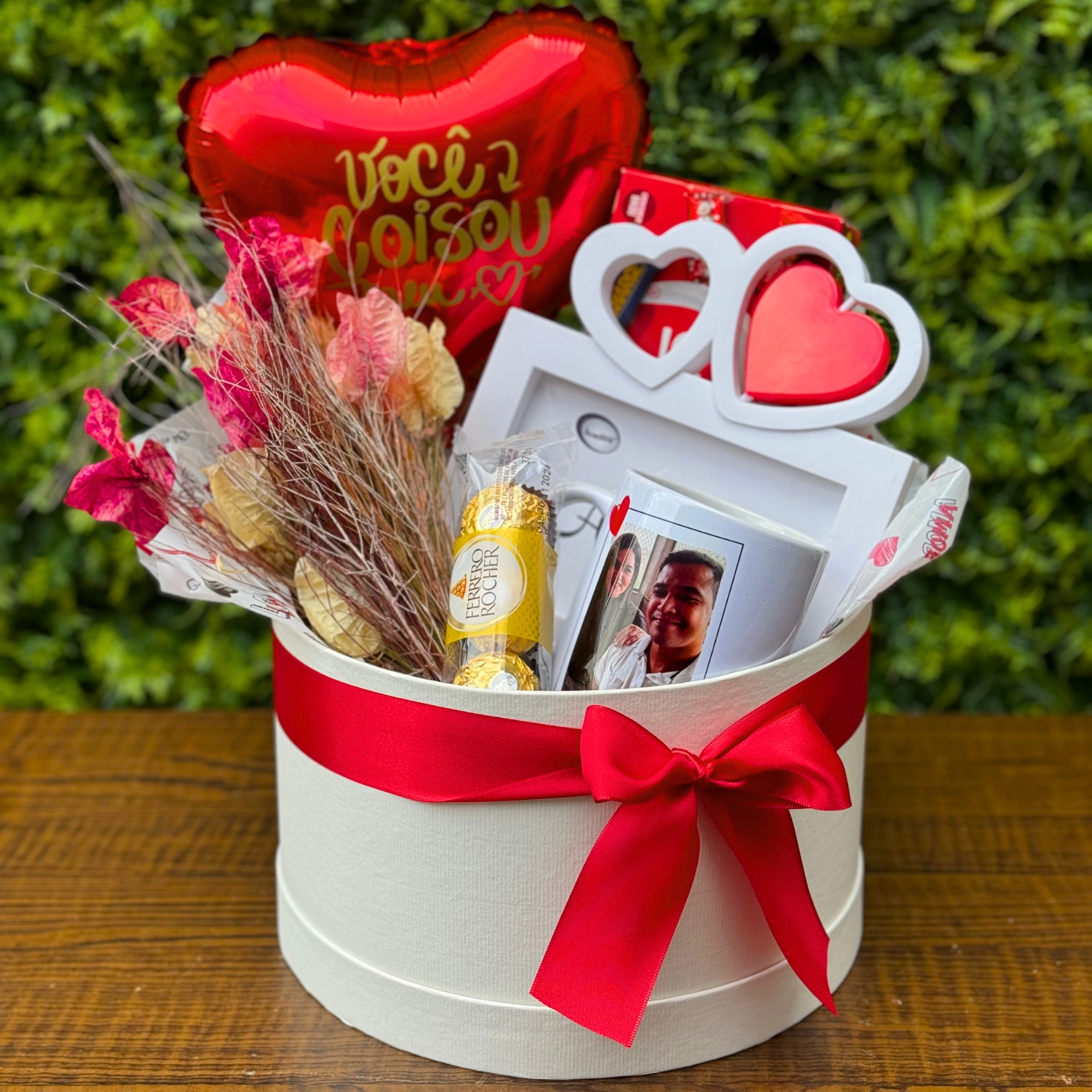 Surpreenda seu amor com a nossa deslumbrante Box Romântica! Repleta de mimos encantadores, esta caixa é o presente perfeito para celebrar o Dia dos Namorados. Dentro dela, você encontrará um porta-retrato para guardar suas memórias mais preciosas, um buquê de flor desidratada para decorar o ambiente, uma deliciosa caixa de bombom, uma elegante caneca de porcelana e um balão de coração personalizado para selar o amor. Como cortesia especial, incluímos uma fotografia sua para adicionar ao porta-retrato, tornando este presente ainda mais memorável.