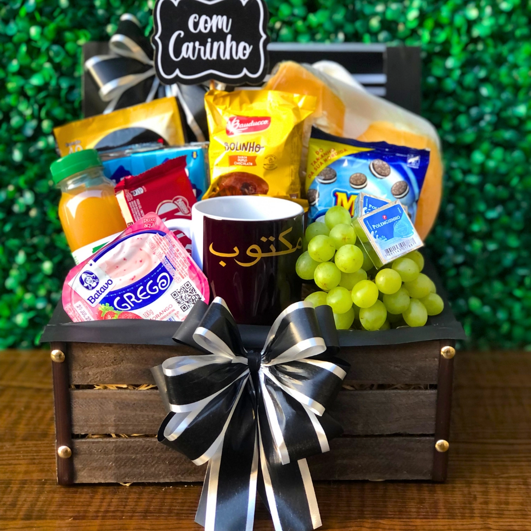 Baú de Madeira decorado Plaquinha MDF 02 pães franceses Presunto fechado Muçarela fechada Café Solúvel 2 Clube Social 2 polenguinhos 2 Bolinhos Bauducco Mini oreo Kit kat Iogurte Uvas Suco de laranja natural Caneca de porcelana Personalizada